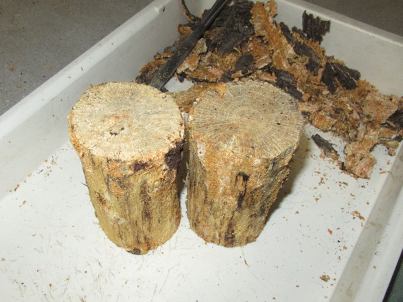 日陰干しが終わった樹皮をステーキナイフで剥がします。