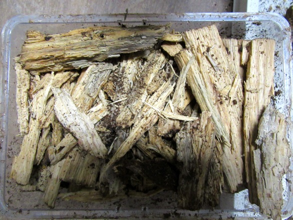 朽ち木やマットの中には、小さな幼虫や卵が残っている事が多いので画像の様に割りカスは、捨てずに元の容器に戻して保管します。