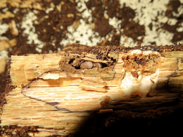 幼虫は朽ち木の中にも普通に食い進んで行きます。