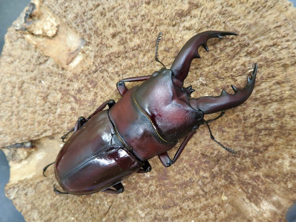 赤みと光沢が強い綺麗な個体です。(左上翅の白くなっている部分は、凹みではなく照明器具の光の反射です。)